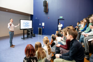 Dr. Johan Mentink legt aan het einde van de projectdag uit hoe de oplossing van de escaperoom te maken heeft met zijn onderzoek. (Foto: Jimmy Israel)